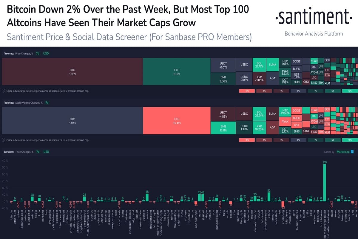 Cryptocurrencies like STEPN (GMT), Zilliqa (ZIL), Aave (AAVE) and Waves (WAVES) have managed to rise by more than 40% despite Bitcoin declining by over 2% in the past 7 days. According to Santiment, crypto enthusiasts’ calls for altseason are huge are and it can be depicted by the data provided.