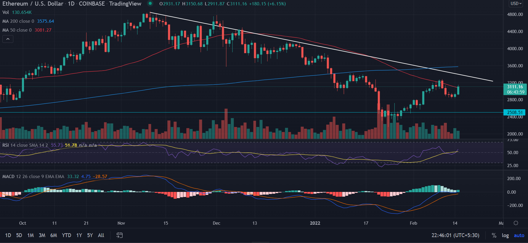 On the daily chart, Ethereum (ETH) crafts a decent price recovery from the swing lows of $2,159.0 with an ascent of 52%. The price is trading just above the 50-day Simple Moving Average (SMA) placed at $3,081.33.