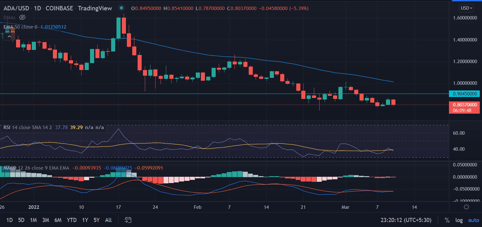 As of writing, ADA/USD is trading at $0.80, down 5.44% for the day.