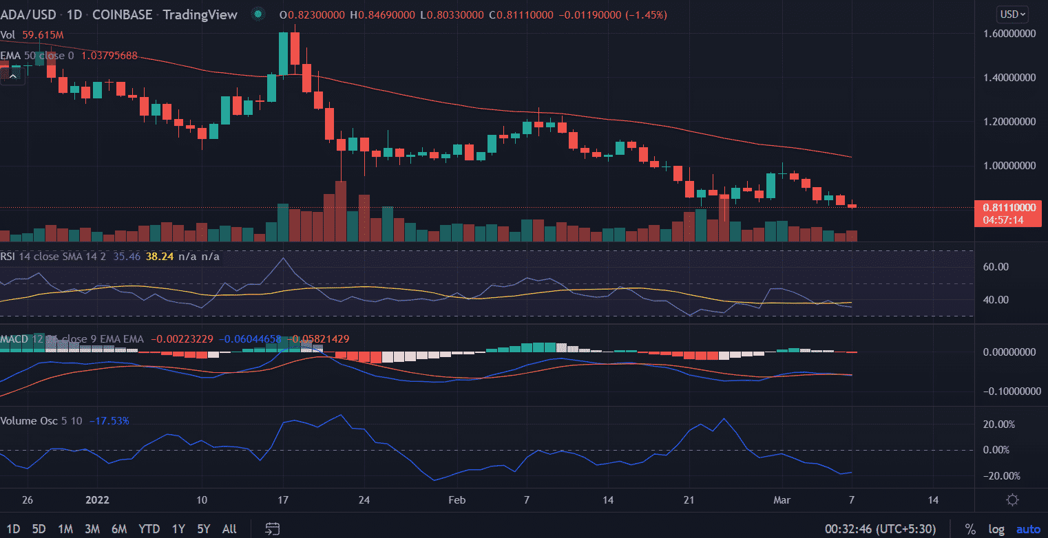 ADA Price Prediction: Remains Pressured Below 50-day EMA; Eyes On February Lows At $0.74