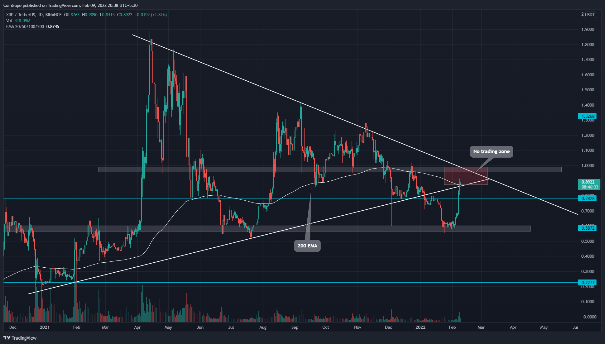 Even though the XRP price is under the influence of a major bearish pattern, the recent price action accentuates the bull power. As highlighted in the recent tweet by Cryptoes, the altcoin price provided a daily-candle closing above the shared resistance of a long coming trendline and 200-day EMA.