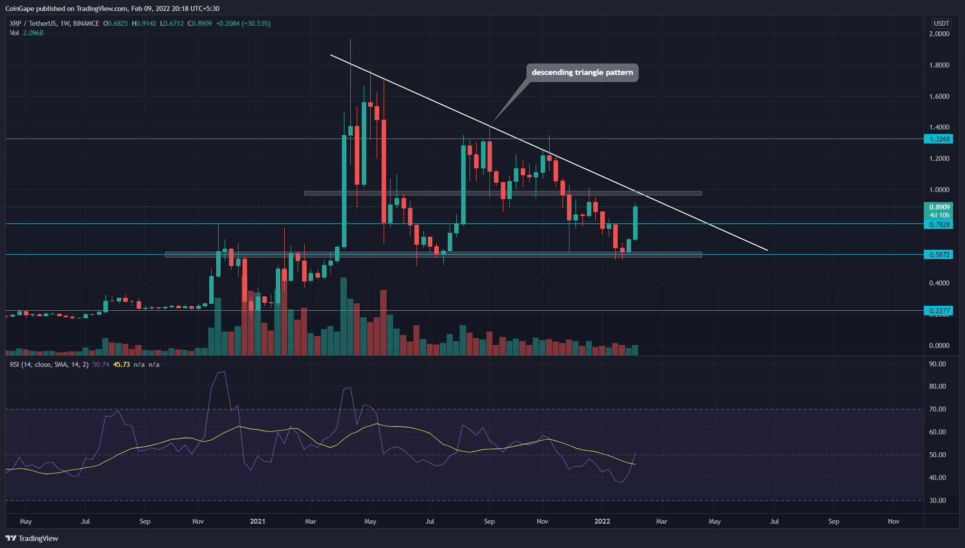 XRP price gradually continued to move up and is currently trading at the $0.88 mark. Furthermore, the XRP technical chart shows a descending triangle pattern, and the coin price is nearing the confluence resistance of the pattern’s resistance trendline and $1 psychological level.