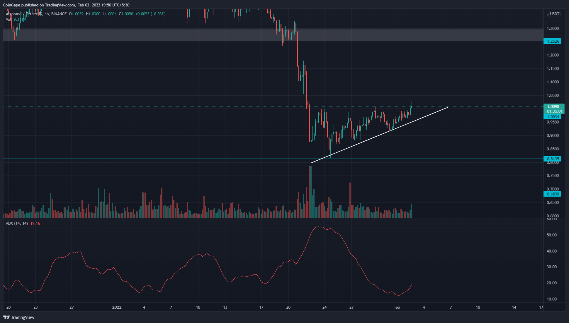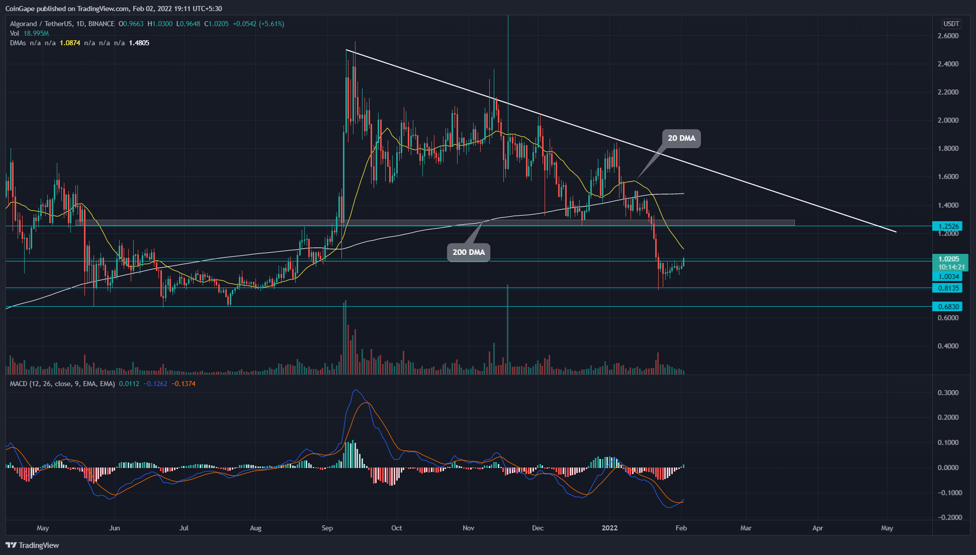 Since last week, the coin price has been wobbling in a narrow range between the $1 and $0.82 mark. Today, the ALGO price finally attempts to breach the overhead resistance for a bullish reversal.