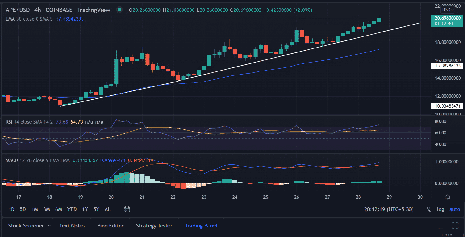On the four-hour chart, the APE price continues to rise from the lows of $10.97, recording exponential gains. In 10-day the price recorded gains of nearly 92% when the broader crypto market failed to lift up the market sentiments. The ascending trend line from the mentioned level acts as a support for the bulls. The price tested the bullish trend line thrice extending from $13.83, $16.17 to $17.85.