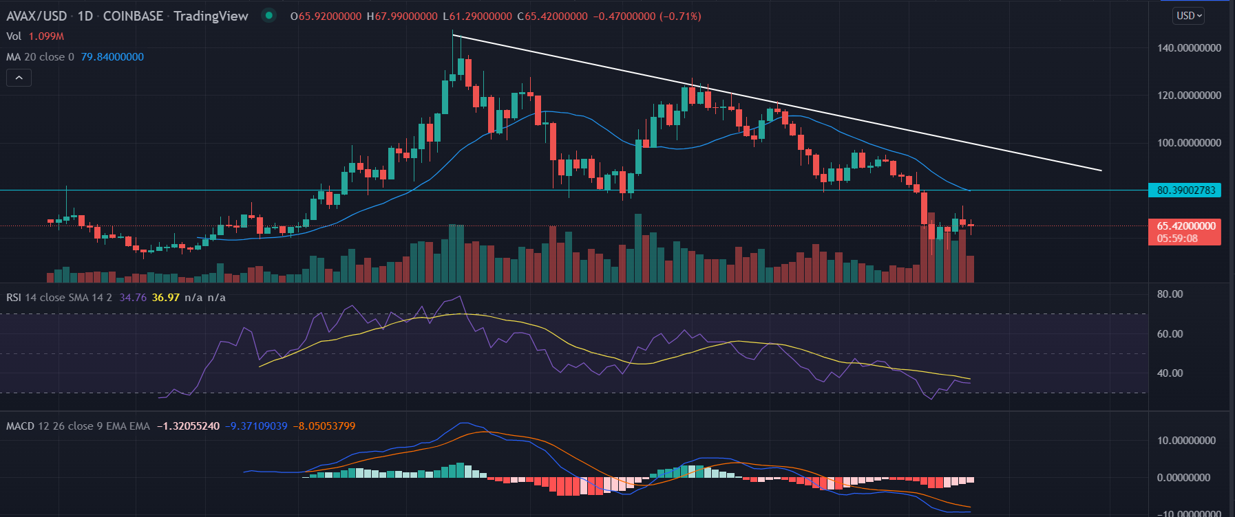 The price still trades below the 20-DMA with no sign of immediate reversal. Both momentum oscillators RSI and the MACD trades in the oversold trajectory telling that the AVAX price is not out of the woods yet.