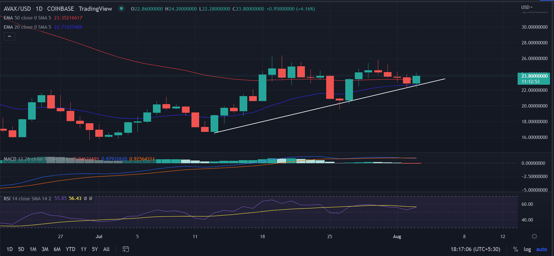 On the daily time frame, the Avalanche (AVAX) price analysis shows that the price is moving near the bullish trend line. Currently, the price managed to hold the gains on Wednesday following four consecutive sessions of fall from the swing highs of $25.81 made on July 29.