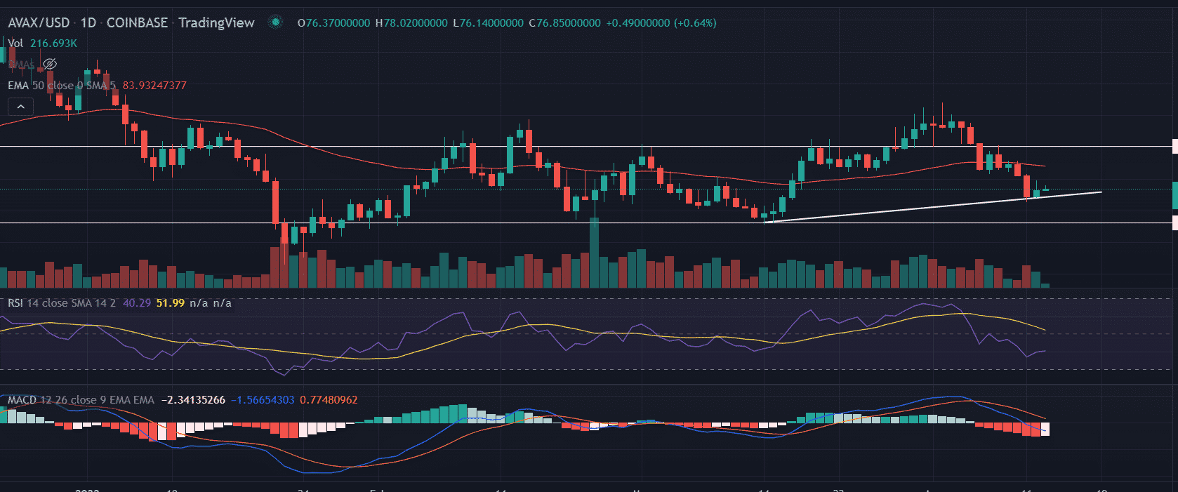 As of publication time, AVAX/USD is exchanging hands at $0.77, up 0.85% so far. The 10-largest cryptocurrency is holding the 24-hour trading volume at $804,653,709 as updated by CoinMarketCap.