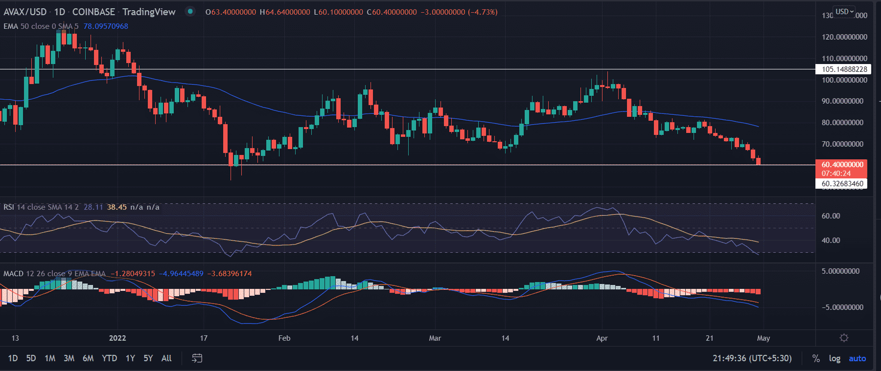 AVAX price dropped considerably as the April session begins. After tagging the highs of $104.0 on April 2. The price booked 42% depreciation. Further, looking at the daily chart, we found AVAX has been consolidating in a short-term trading range of $106 and $60 with both sides capped. The price constructed a reliable support zone around $60.0 extending from January 22 to April 30.