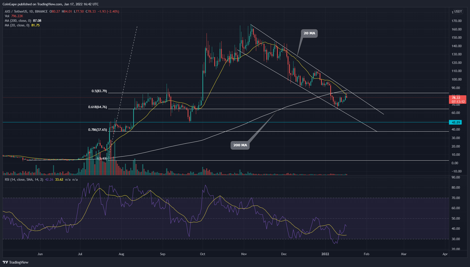 A falling parallel channel pattern is leading the correction rally in the Axie Infinity (AXS) price. Though this falling pattern is now stretching the down rally, a bullish breakout from its resistance trendline could begin a new rally in the AXS coin. The coin price currently trading at $77.4 has so far discounted by 53% from the All-Time High of $164.