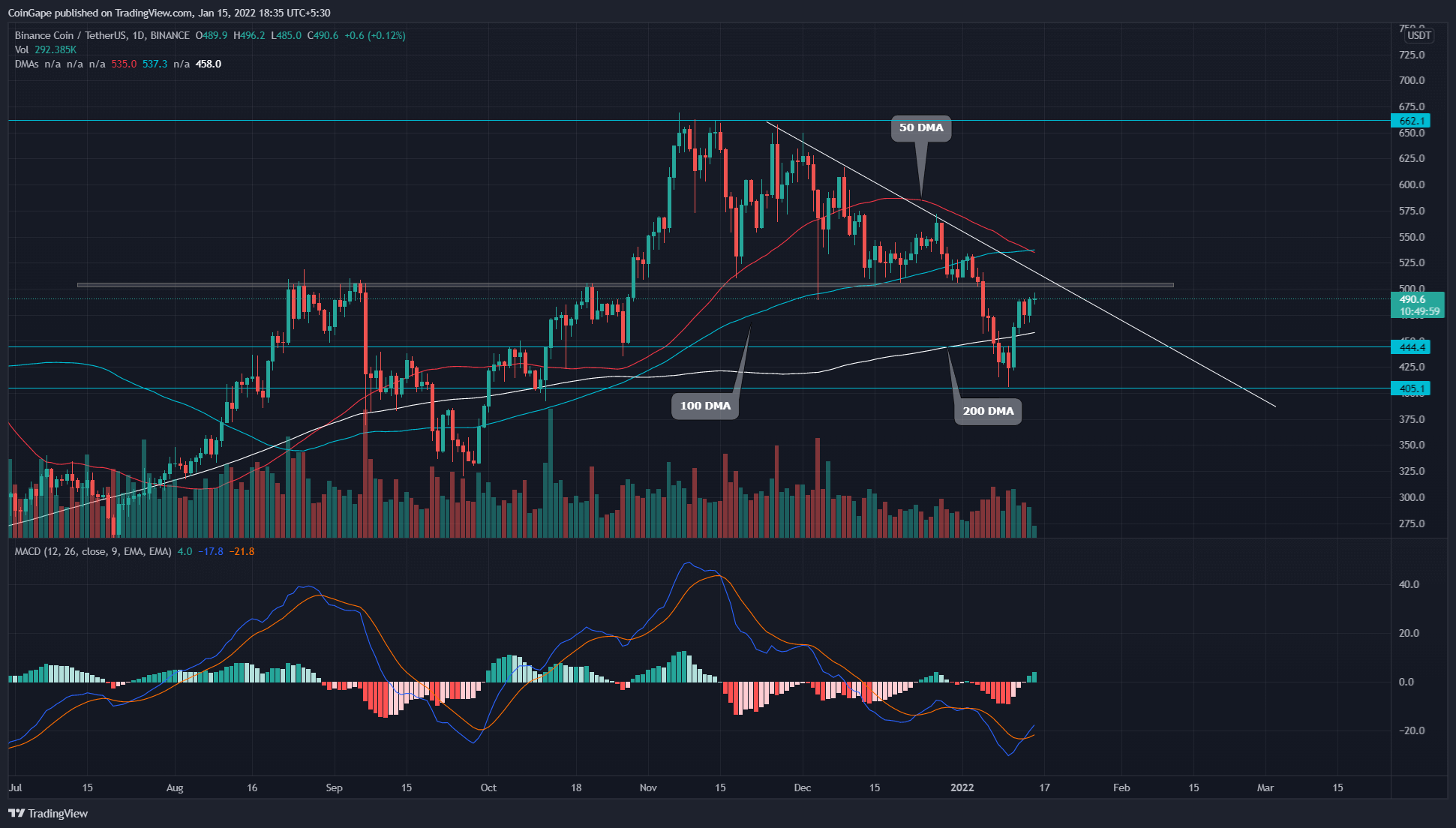 The Binance coin price is currently trading at the $492 mark, indicating a 21% growth from the $400 support. Furthermore, the price will soon challenge a combined resistance of $500 and a long coming descending trendline.