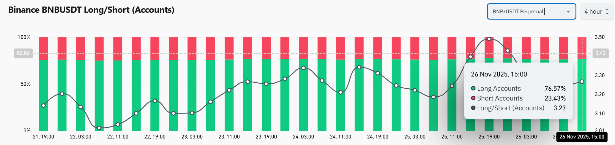 Derivatives data strengthens this case because long accounts hold 76.57% of positions against 23.43% short, and the 3.27 ratio reveals strong preference for upside continuation. This bias supports BNB’s push toward $943, and the combined ETF and technical factors reinforce a probable attempt at $1,000 once resistance breaks.