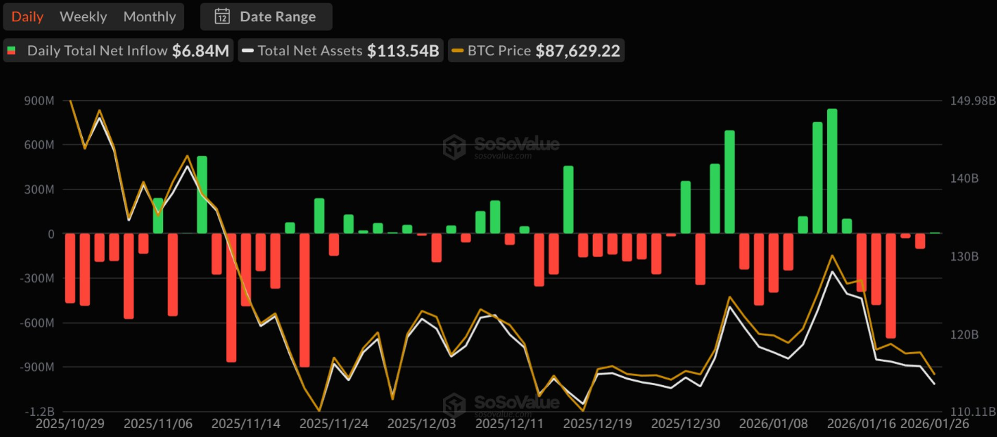 U.S. spot Bitcoin ETFs reported net inflows of $6.84 million, breaking a five-day streak of outflows, according to SoSoValue data.