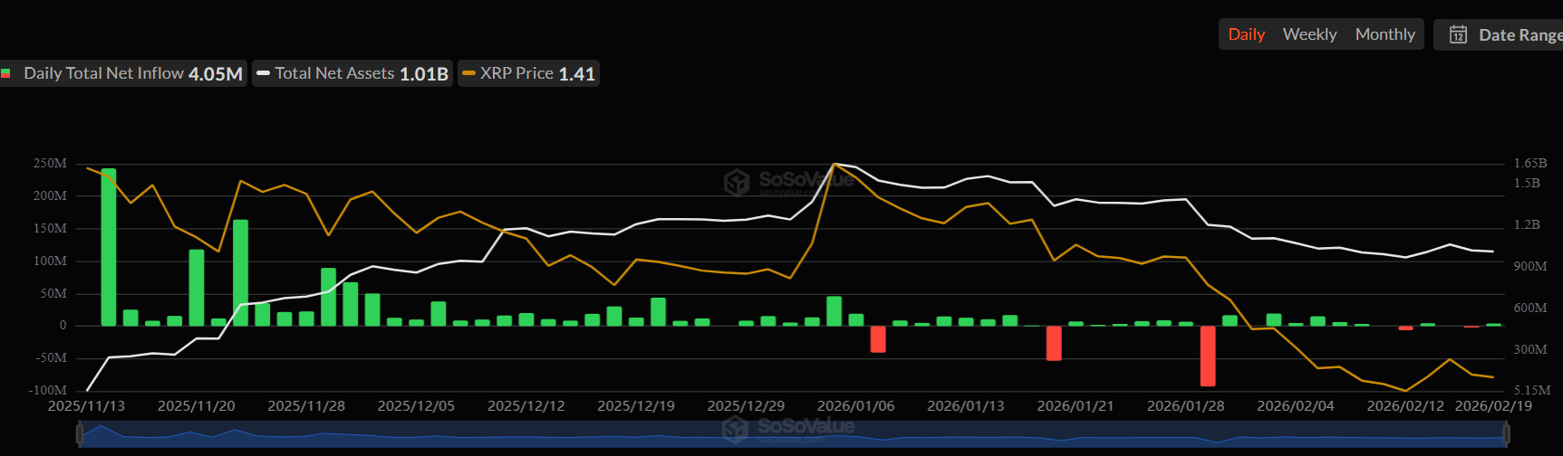 XRP is also experiencing positive inflows, with daily net inflow of totaling $4.05 million. Conversely, Bitcoin ETFs posted a net outflow of 166 million on February 19, the third consecutive day of declines.