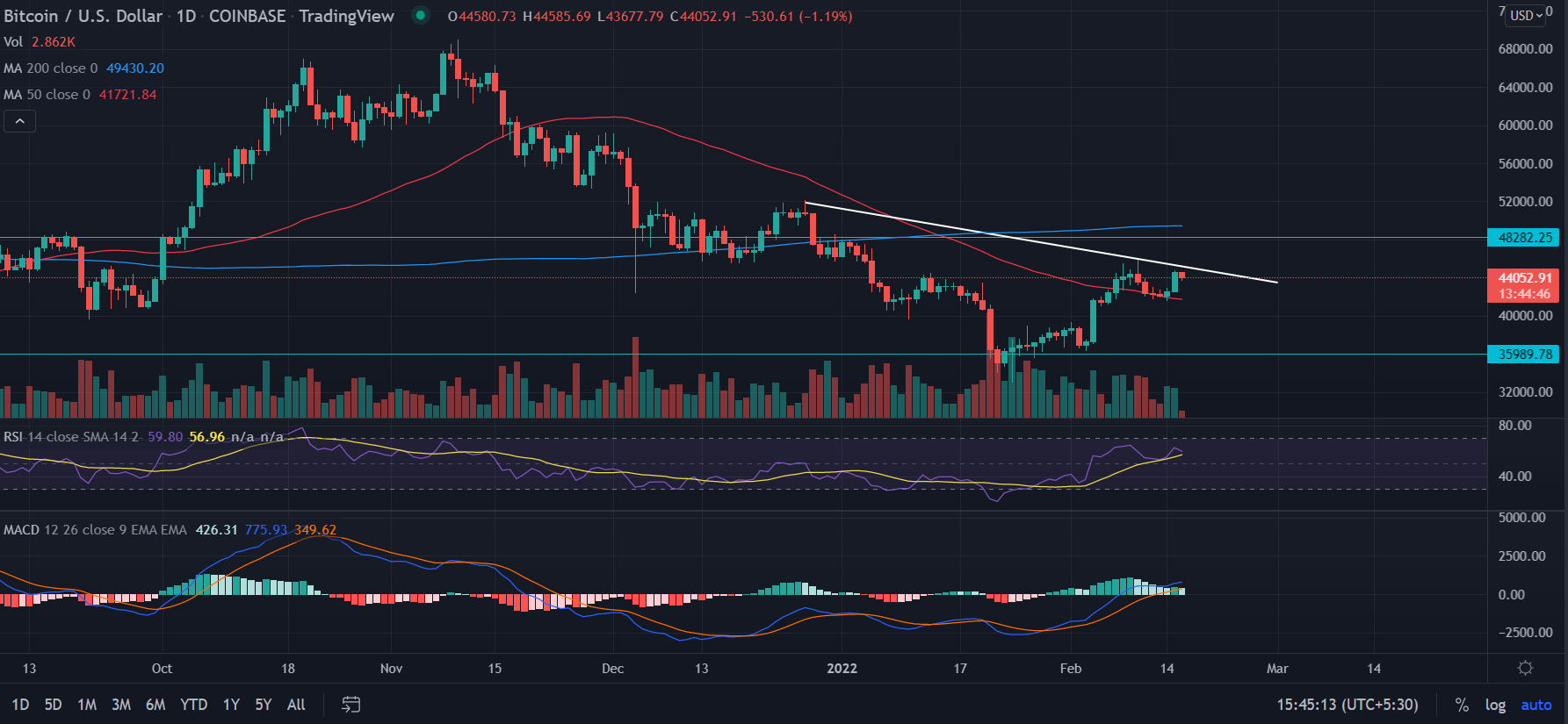 On the daily chart, Bitcoin (BTC) price after rallying nearly 40% from January’s lows finds some strong foothold near the 50-day Simple Moving Average (SMA) at $42,418. The descending trend line from the highs of December $52,100 acts as a strong resistance barrier for the bulls.