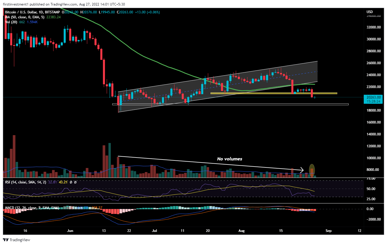 Further, the price finally breaks the low of the pattern’s breakdown candle and closes below it in August. 26. Along with an above-the-average volume, as shown in the chart. This combination of price and volume prints a bearish outlook for the largest coin in the short term.