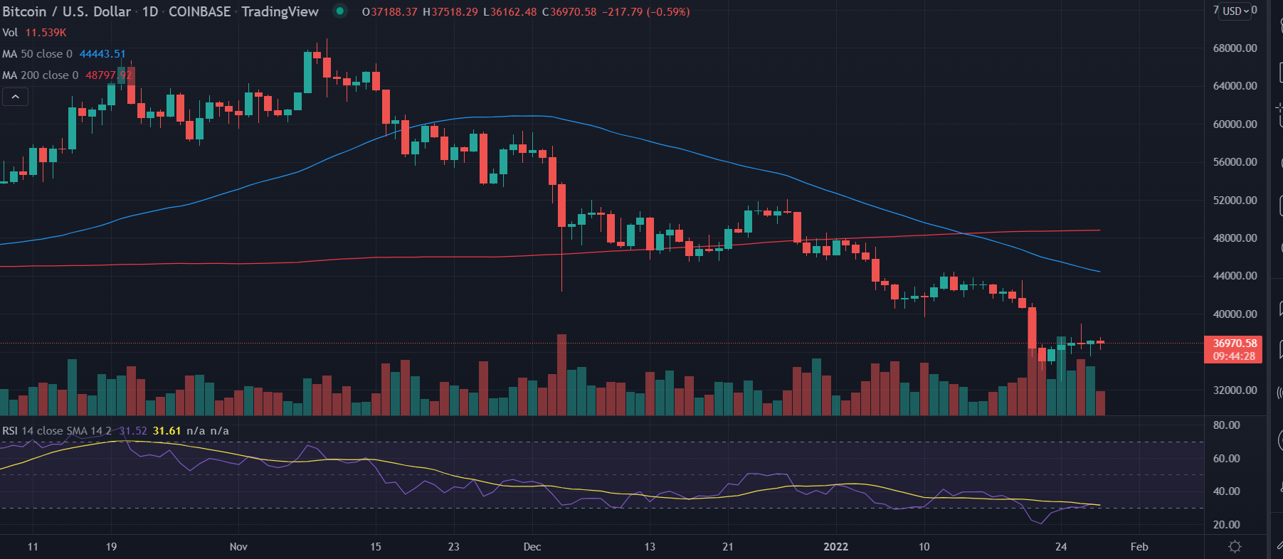 On the daily chart, the Bitcoin (BTC) price has encountered the death-cross near on January 15 near $48,000. The BTC/USD pair has retreated almost 31% toward the recent lows of $32,933.33.
