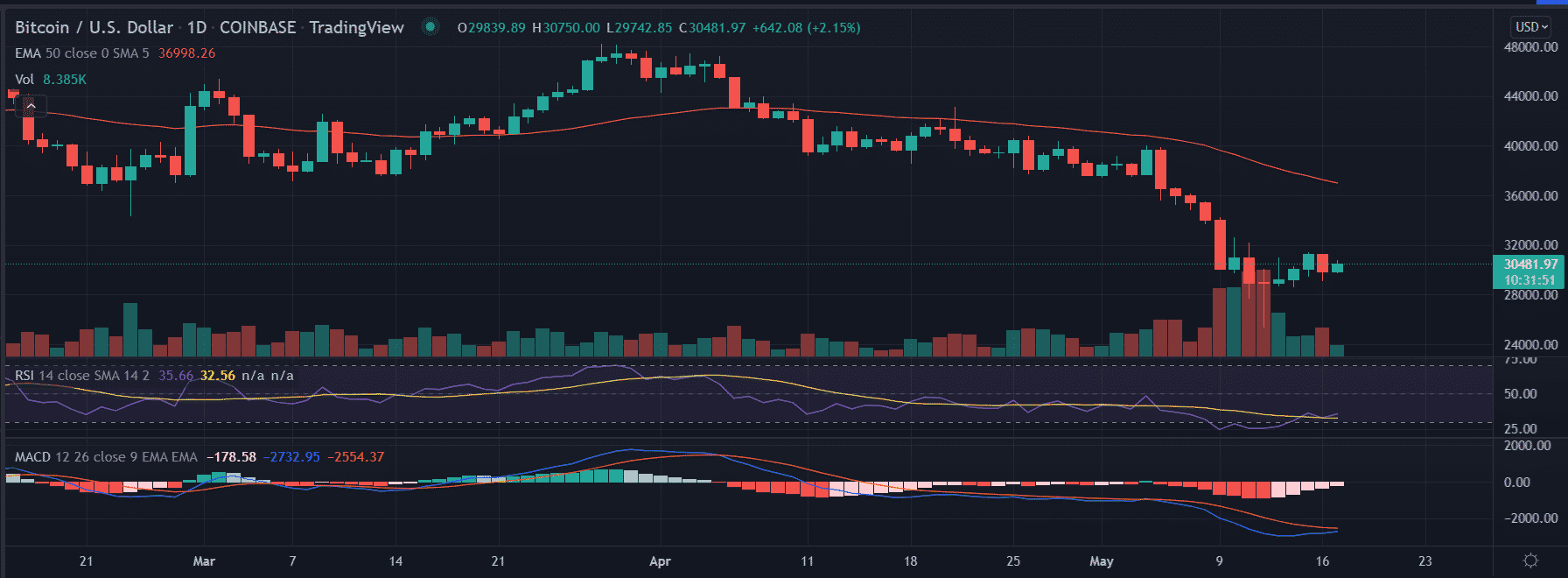 On the daily chart, the BTC price has recovered from the previous week’s lows with an ascent of nearly 30%. However, the BTC buyers find it challenging to cross beyond $31,000. The trading volume is not rising in sync with the growth in the price, citing some challenges for the buy-side investors.