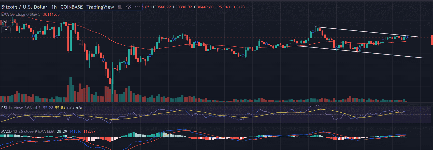 As of press time, BTC/USD reads at $30, 687, up 2.08 for the day. The largest cryptocurrency holds the 24-hour trading volume at $29,046,532,955 with 16% losses as update by CoinMarketCap.