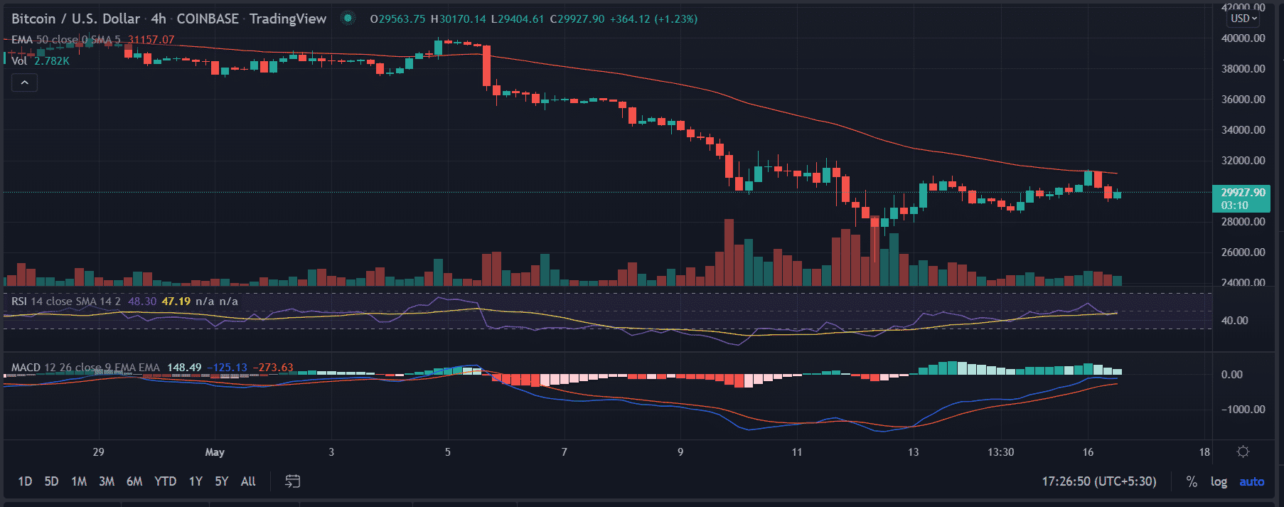 As of publication time, BTC/USD trades at $30,000, up 1.25% for the day.
