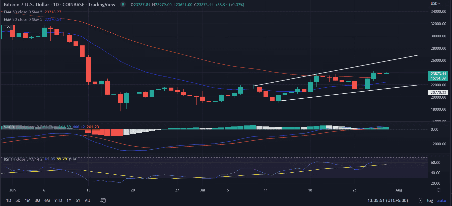 On the other hand, a break below the session’s low would entice bears to enter into trade. In that case, the price could meet the 50-day EMA at $23,191 followed by the low of July 24 at $22,263.