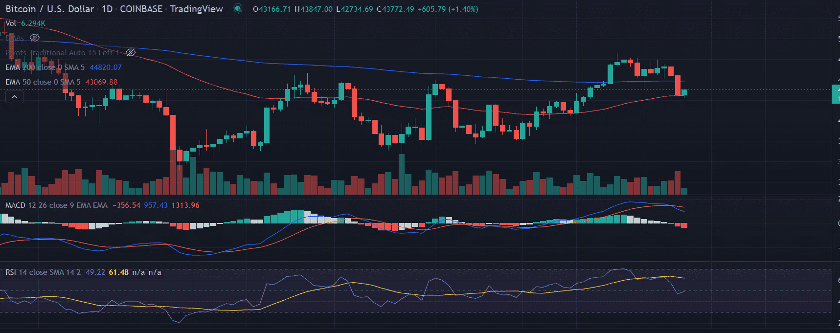 On the daily chart, the BTC price is hovering near the 50-day EMA (Exponential Moving Average) at $43,064.0. This stoppage in the price could be of great significance as it already sliced another critical moving average of the 200-EMA.