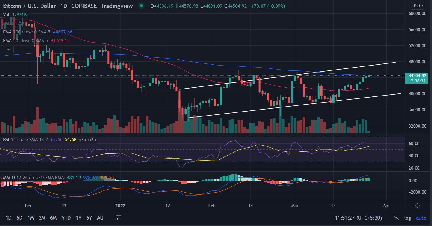 As of publication time, BTC/USD trades at $44,510, up 0.41% for the day.