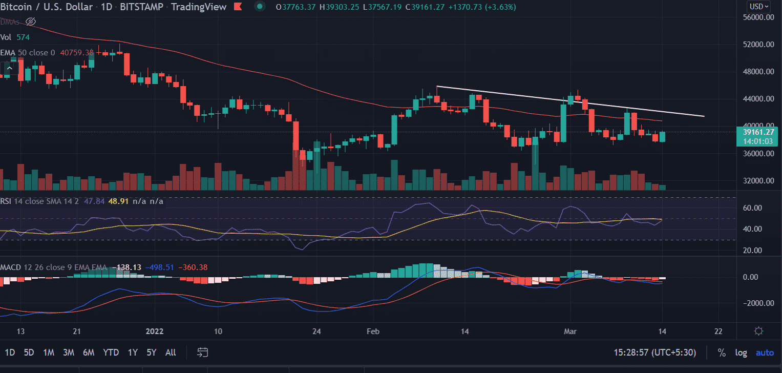 Bitcoin price remains pressured near $39,000 and is making effort to move higher. In today’s session, BTC opened lower but quickly recovered to test sessions’ high at $39,220.0. On the daily chart, the price face multiple rejections near the descending trendline, which is extending from the highs of $45,850 made on February 10. Further, the Bitcoin price failed to slice above the bearish trendline in February.