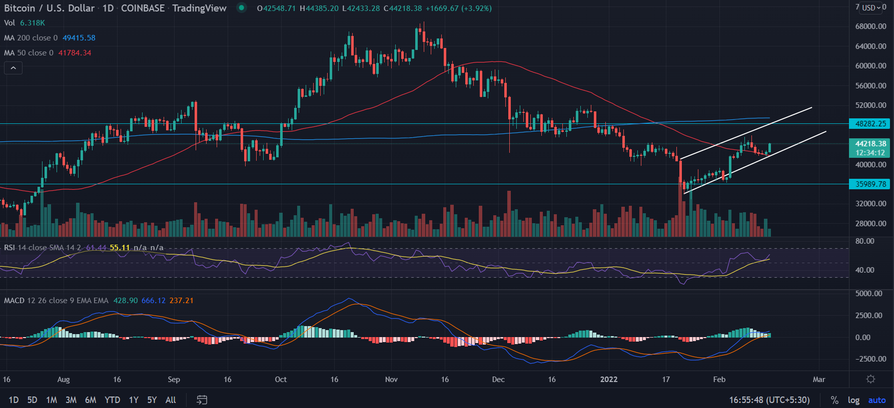 As of press time, BTC/USD is trading at $44,315, up 4.05% for the day. The live 24-hour trading volume stands at $24,465,361,287 with gains of 35% as per the CoinMarketCap.
