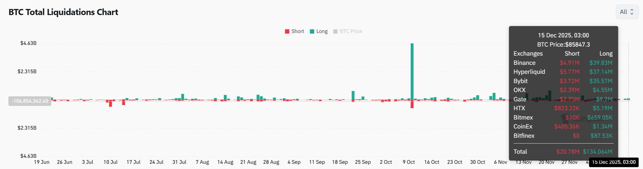 BTC Long vs Short Liquidations Chart (Source: CoinGlass)
