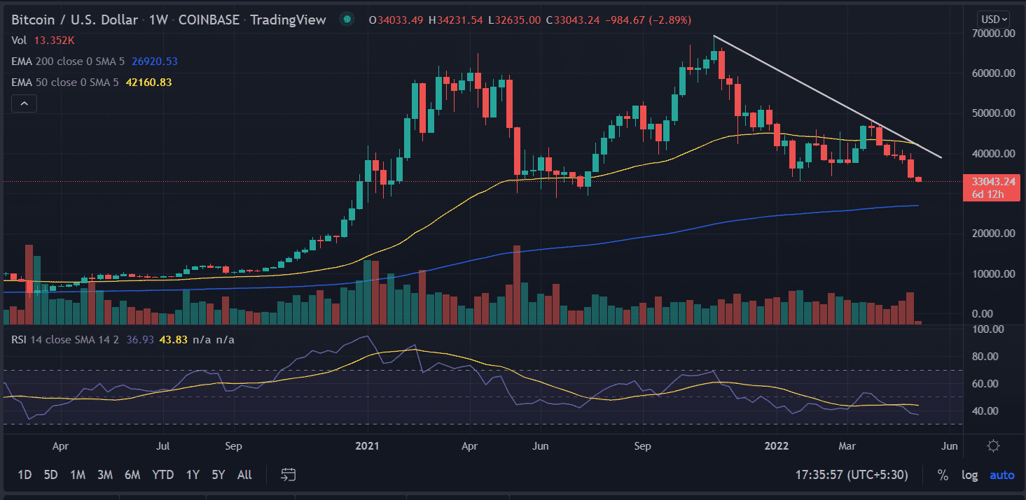 The Crypto market bleeds as the bear took the charge. BTC has crashed more than 50% since it made record highs in November at $69,000. The descending trend line on the weekly chart acts as a resistance for the buyers. As the bulls attempted to breach the bearish slopping line in March but failed to do so. In fact, it intensify the selling pressure and pushed the price to breach the recent swing lows placed at $32,717.08.