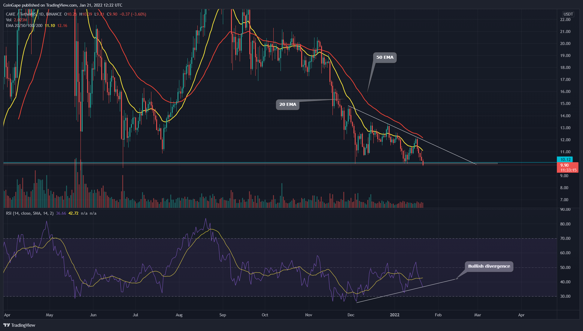 Last time we covered an article on CAKE token price analysis, coingape warned that the CAKE/USD price could drop to $10 support. Despite a sequence of lower highs on the upside, the bulls have managed to sustain the price above this support, resulting in a descending training pattern in the daily chart.