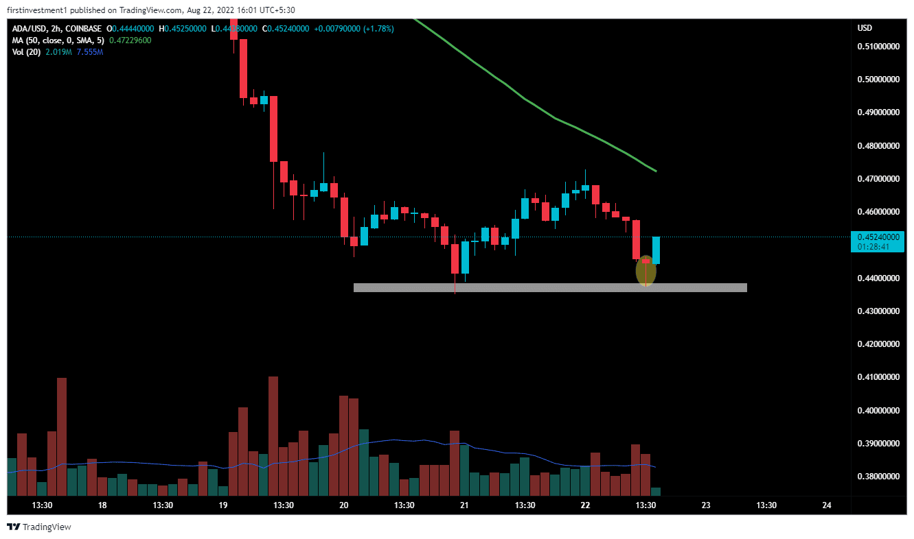 If the price closes above $0.45, on the two-hour chart, we can expect a short-term reversal, which will be good for shorting on higher levels. Further, a break above the $0.4715 level amid sustained buying momentum could invalidate the bearish outlook. And the price can move toward $0.50.