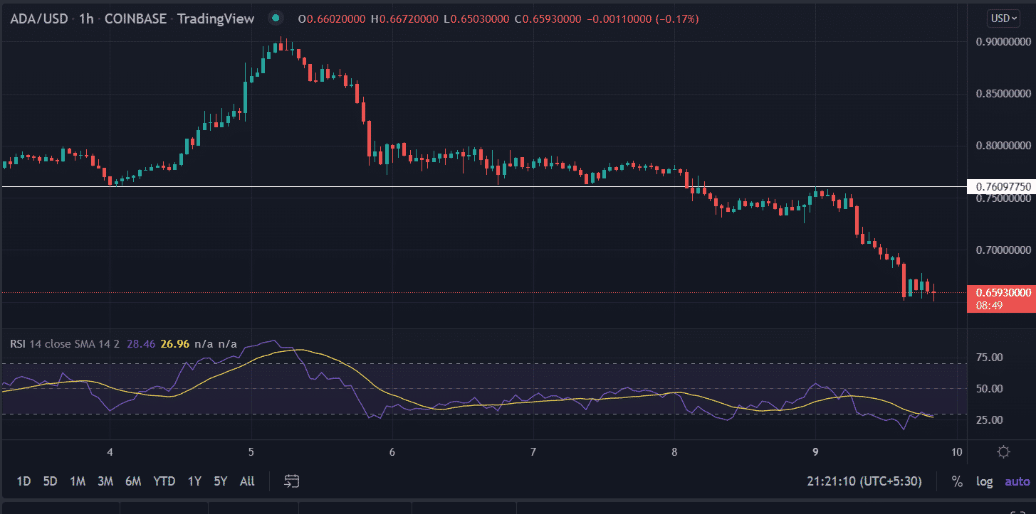 On the hourly chart, the ADA price faces strong rejection near $0.91 in the previous week, which proved fatal for the digital asset. With the mentioned price action the bears found another chance to capitalize on the prevailing long trend. As a consequence, the price depreciates 19% in three-day.