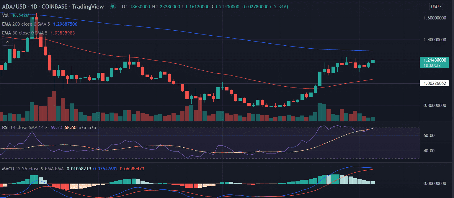 As of publication time, ADA/USD is trading at $1.21, up 2.56% for the day. The 24-hour trading volume of the seventh-largest cryptocurrency is standing at $1,717,138,700 with more than 55% gains. A rise in the price along with volumes is a bullish sign for the asset.