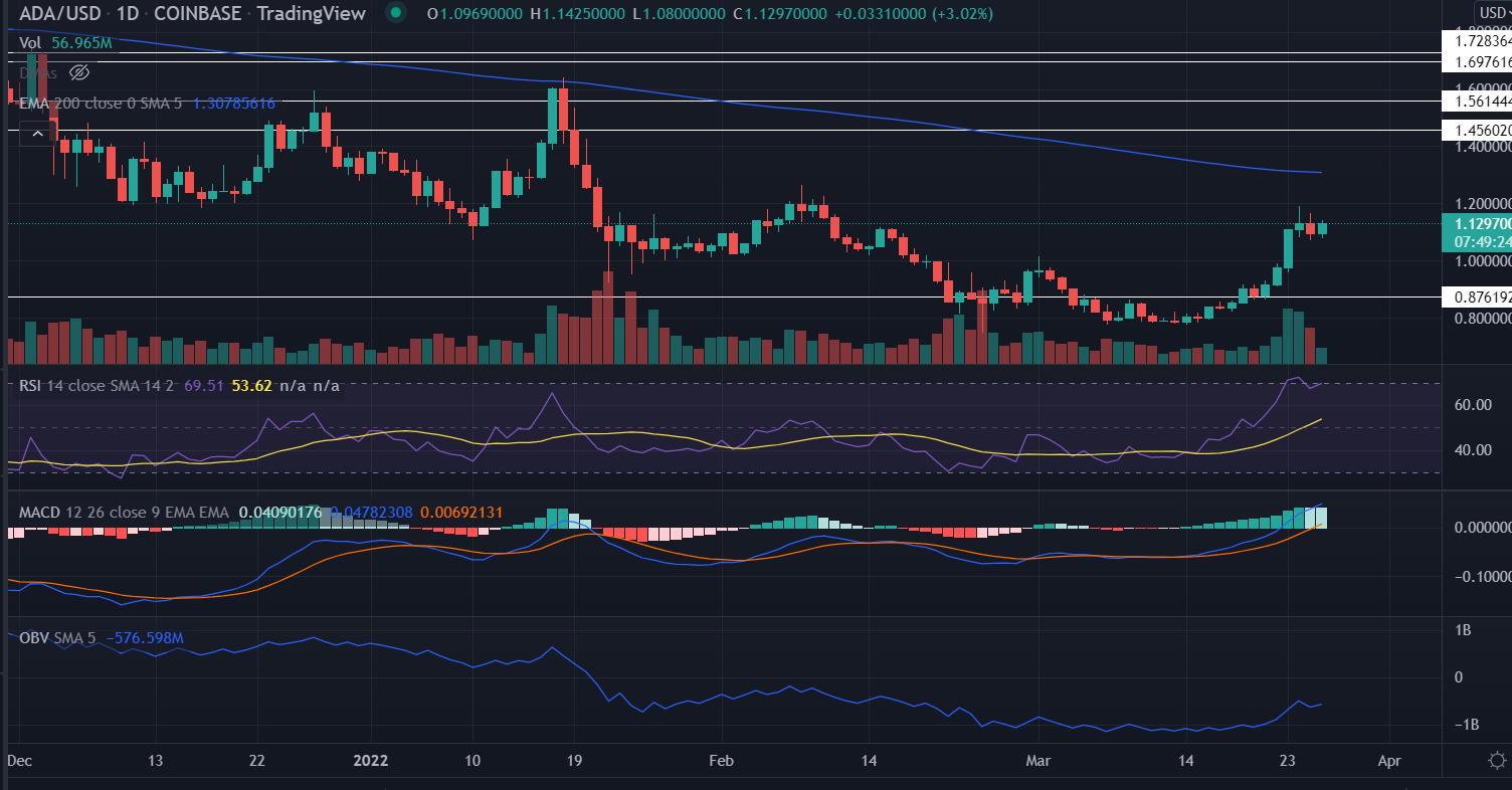 As of publication time, ADA/USD trades at $1.13, up 3.60% for the day. The 24-hour trading volume of the seventh-largest cryptocurrency by market cap holds at $1,727,823,516 with a decline of more than 14%.