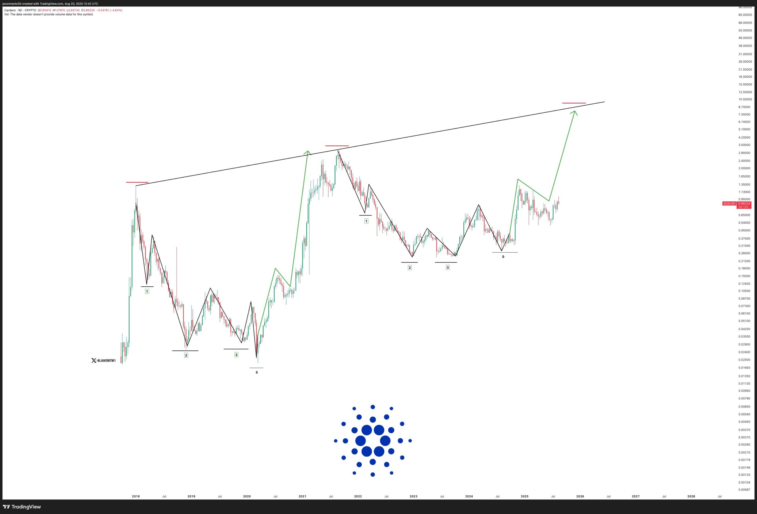 Marks mapped out a potential move to $8, which would represent a 740% rally from current levels. While bold, the target tracks ADA’s long-term trendlines and echoes previous cycle highs.