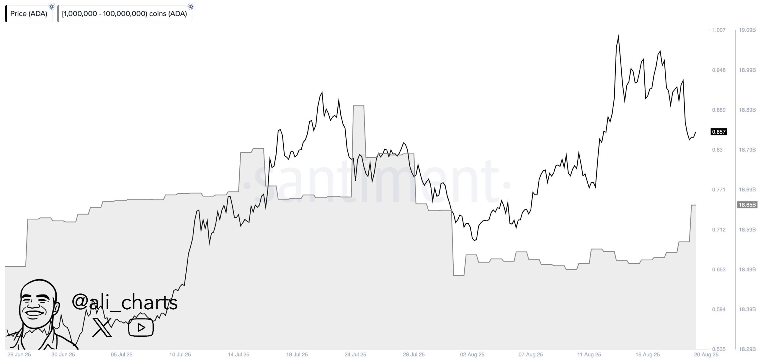 As far as investors are concerned, whales have just made a huge move. Ali Charts, an analyst on X platform, reports that over 100 million ADA was bought within the past 24 hours. That is not retail noise, that is serious capital positioning in anticipation of something big. Moves such as that do not occur spontaneously.