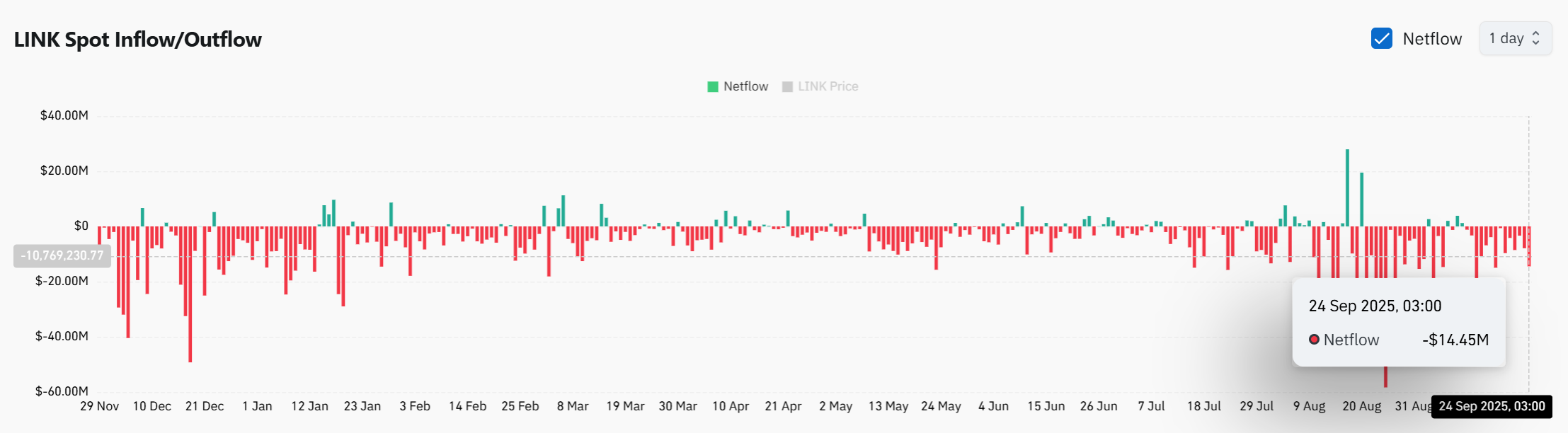 Netflow data also supports this narrative, with outflows showing $14.45M on September 24, according to CoinGlass. Consistent negative netflows indicate coins leaving exchanges, reducing available supply for immediate selling.