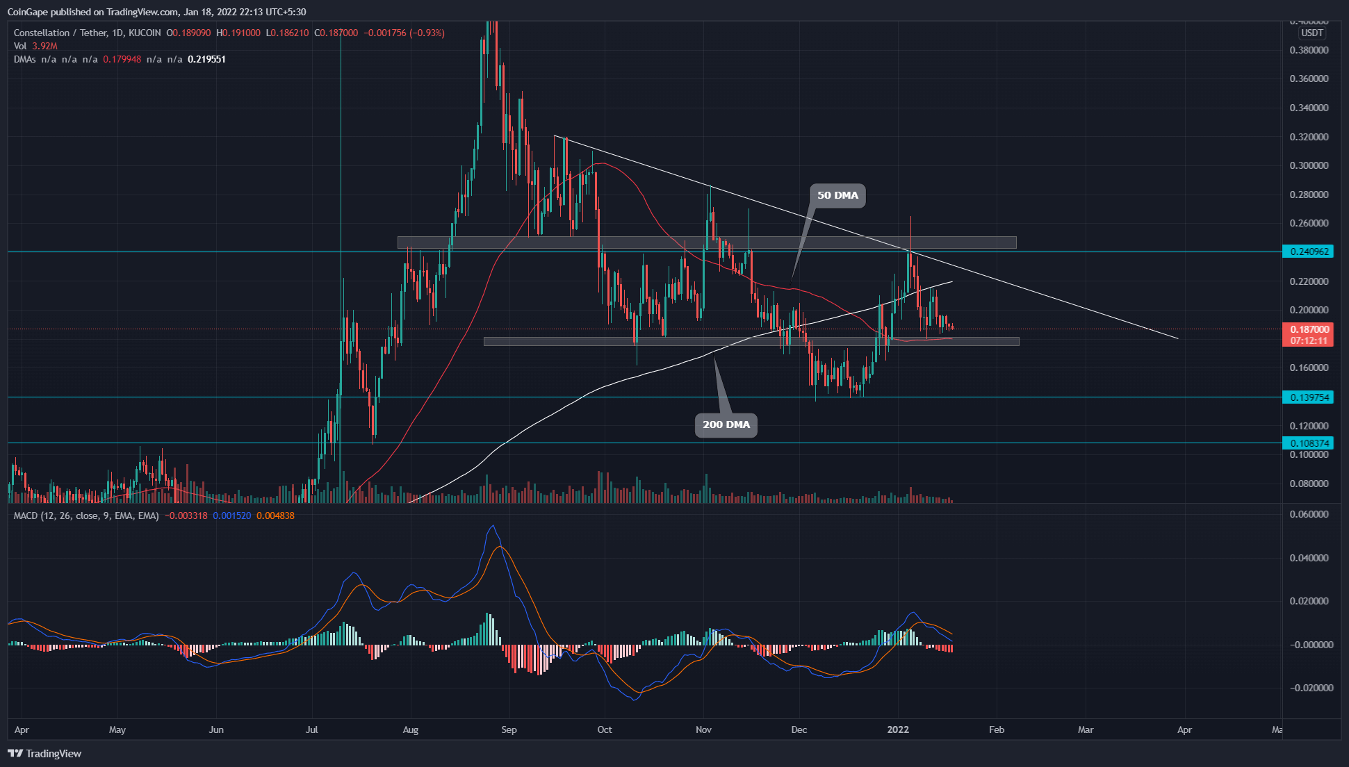 During the third quarter of 2021, the DAG coin parabolic rally entered a correction phase. This moderate pullback plunged the price to the $0.14 mark, indicating around 70% loss from the All-Time High($0.462).