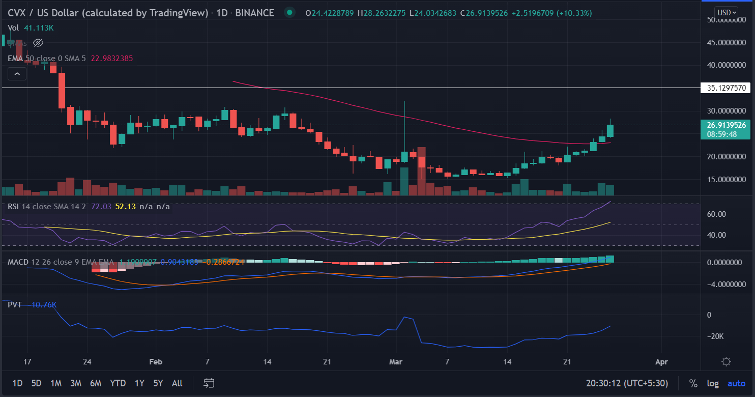 As of press time, CVX/USD trades at $26.93, up 10.26% for the day. The 24-hour trading volume stands at $55,631,785 as per the CoinMarketCap.