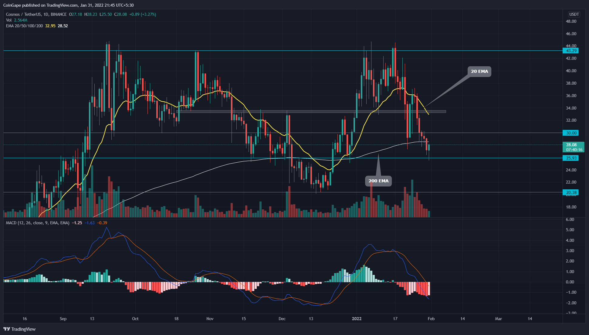 The ATOM price finally forms a bullish candle in the daily chart with a significant lower price rejection near the $25 mark. However, the price is yet to break above the 200-day EMA until then the jump remains a retest of the fallout.