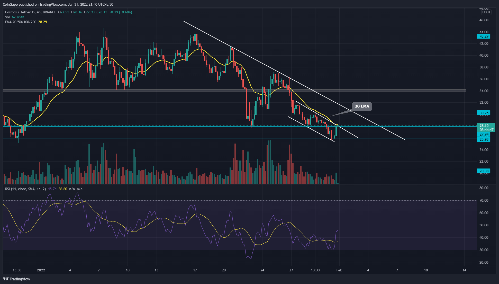 After the correction phase of more than 35%, the ATOM price finds demand near the $25 mark and jumps more than 7% in the past day. The price action forms a short falling channel, the breakout of which will result in a significant bullish jump.