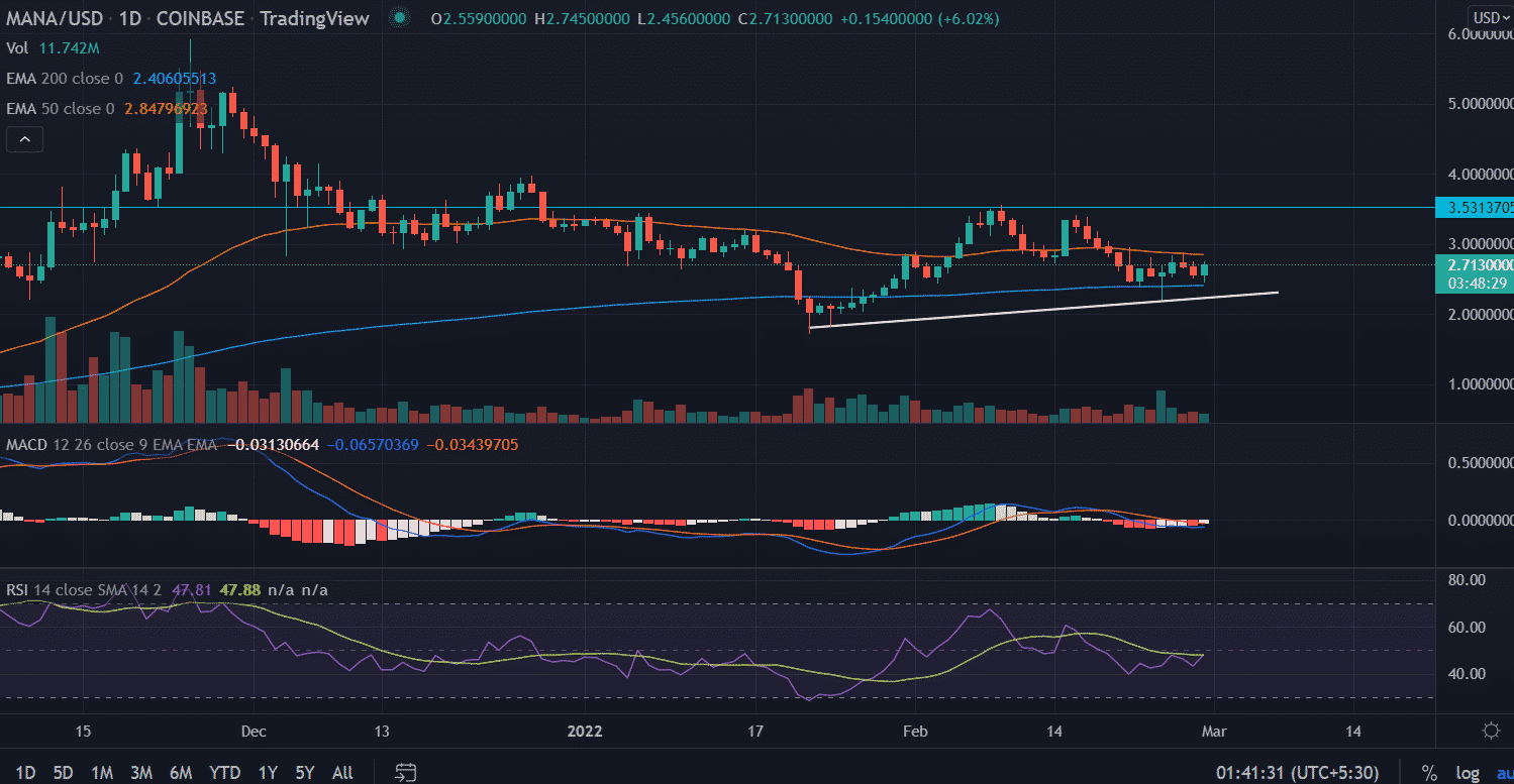 As of press time, MANA/USD is exchanging hands at $2.70, up 5.86% for the day. As per CoinMarketCap, the 24-hour trading volume of the 30th largest cryptocurrency by market cap stands at $856,138,404.