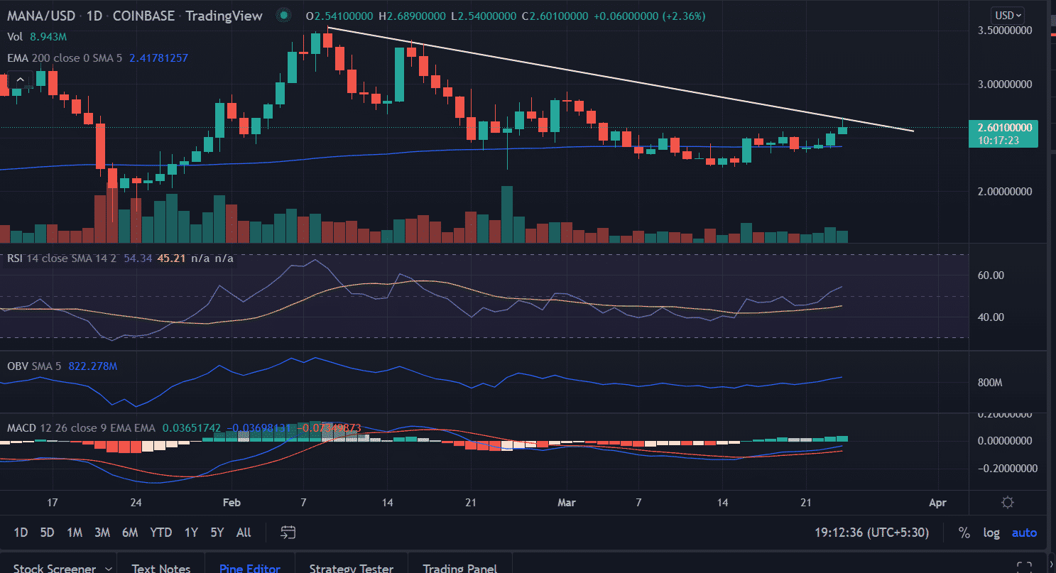 Currently, the MANA price is again making an attempt to breach the bearish slopping line. If that happens, in that case, the road will be clear for $3.0 next.