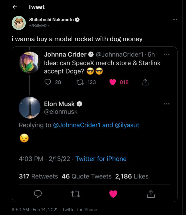 In a recent update, Elon Musk has signaled that satellite internet provider Starlink could start accepting Dogecoin. Starlink is committed to offering high-speed broadband internet to customers in the most remote area of the planet. Further, the rumors are ripe that Musk’s SpaceX could also enable Dogecoin payments. According to the U.Today, the space exploration company is already in the process to accept DOGE for a moon mission called DOGE-1 that is supposed to launch in the first quarter of 2022.