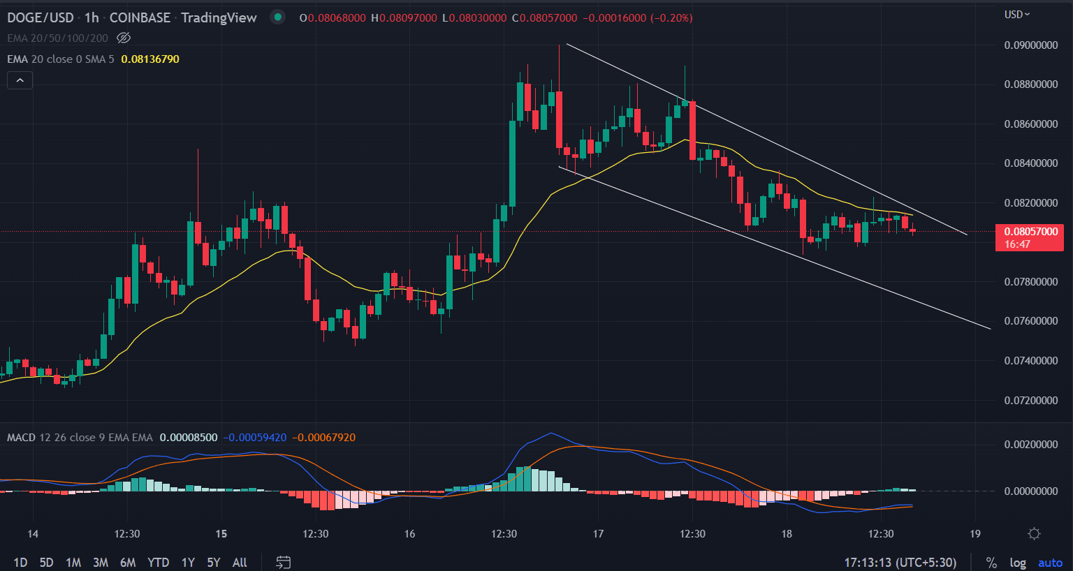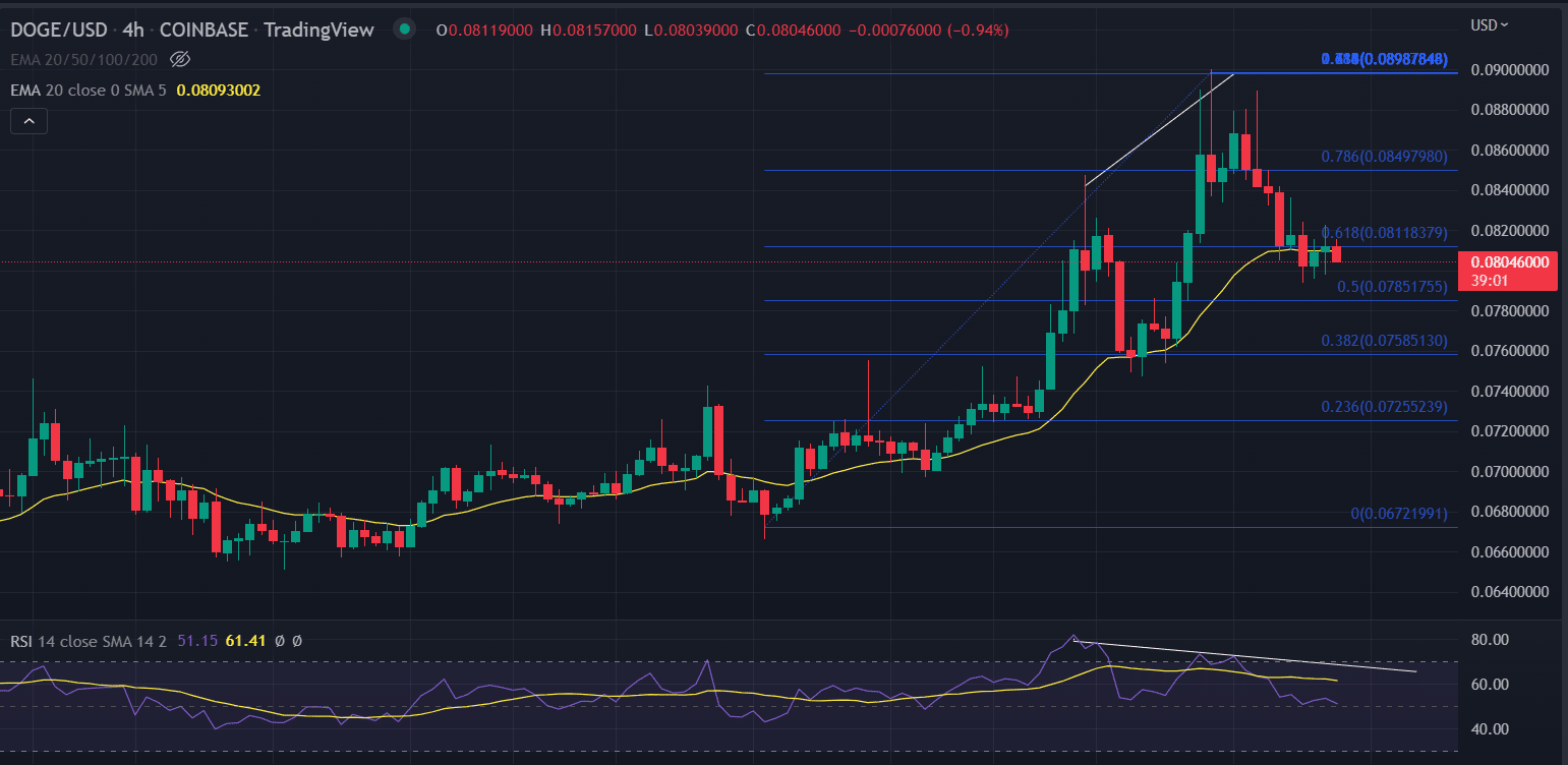 On the four-hour chart, the dogecoin price found support at the 61.8% Fibo. Retracement level. This also coincides with the 20-day exponential moving average (ema) at $0.080.Thus, the $0.080 remains a crucial level to trade for both bulls and bears.