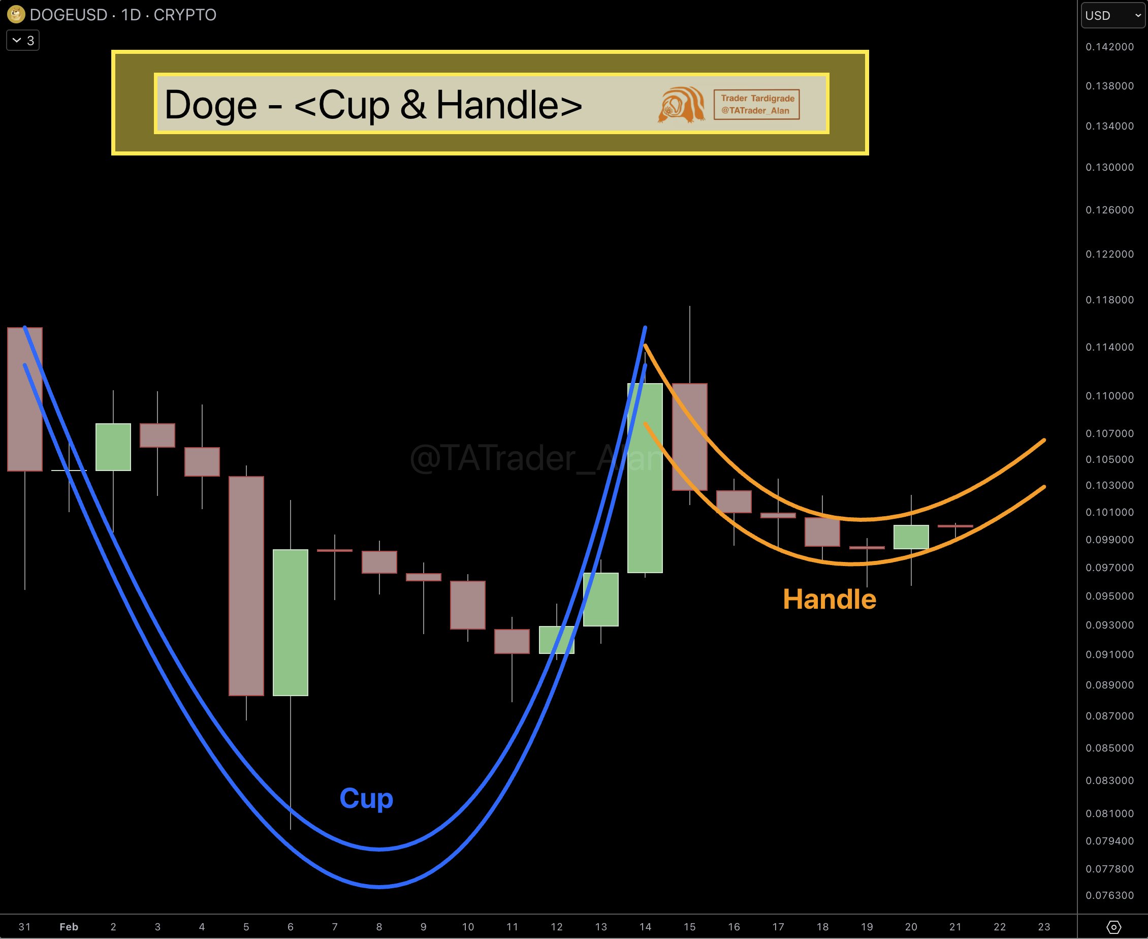 The analyst says that Dogecoin has recently filled a clean cup shape following a stable recovery. The price now seems to be drawing the handle, which is the last step, before a possible increase.