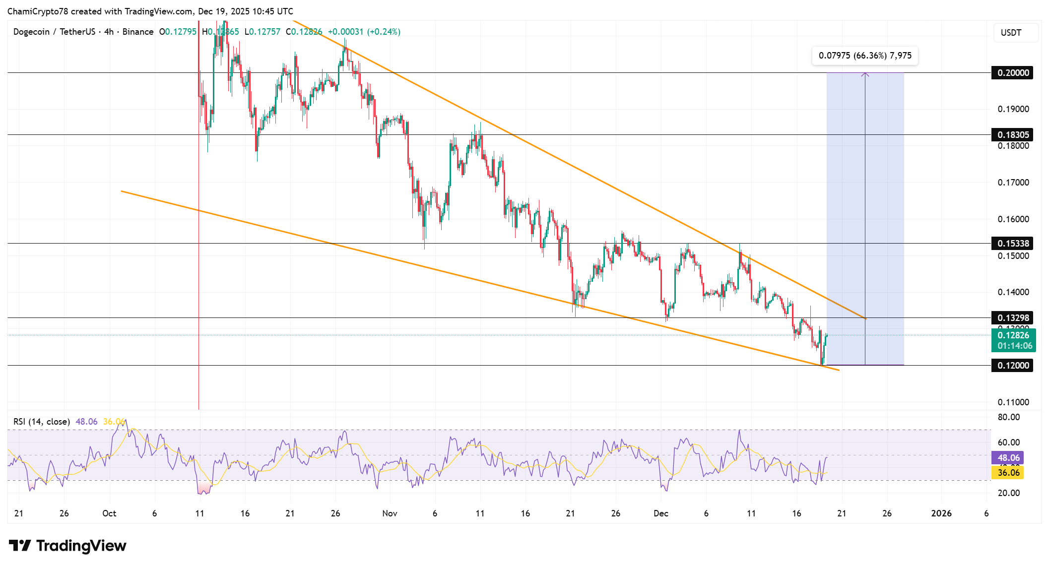 At the time of writing, the DOGE market value is pegged at approximately $0.128 after making a steep intraday recovery. Notably, price has re-taken short-term structure and is holding above wedge support. Such action usually comes before quantifiable upward efforts as opposed to direct turnarounds.