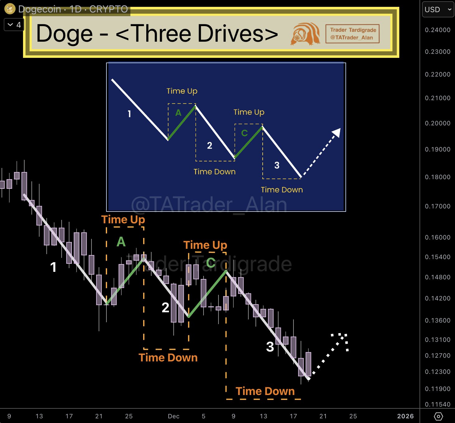 Defended demand and controlled compression are emphasized by analyst structures. If price sustains higher lows and confirms a wedge resolution, future Dogecoin price performance could extend toward the $0.20 region