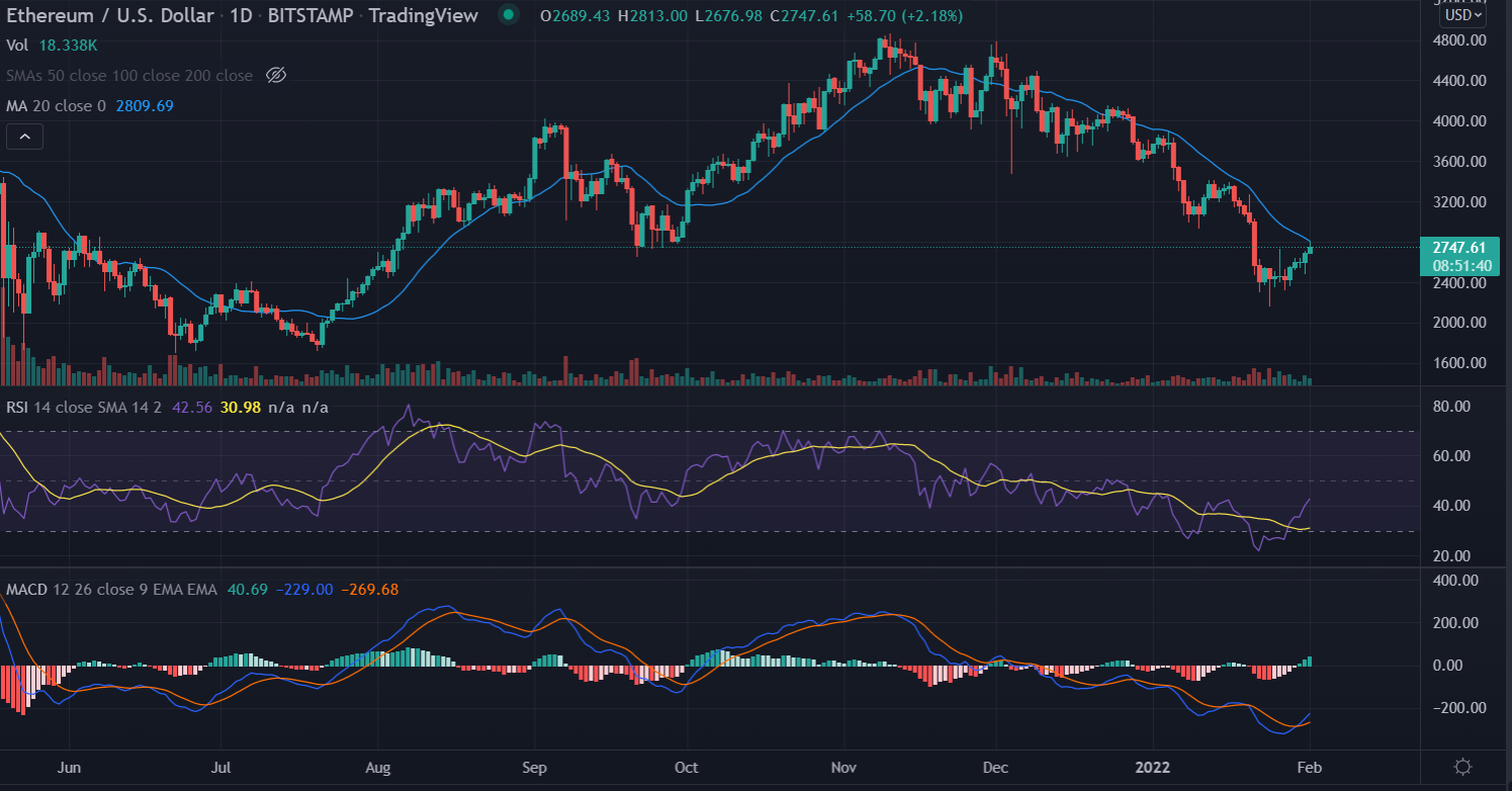 On the daily chart, after consolidating near the $2,300 level ETH/USD is started to rise from January 28. However, the bulls need to maintain the momentum to seek an upside of 30% from the current levels. The first hurdle for the investors is placed at the January 21 high of $3,034.02.